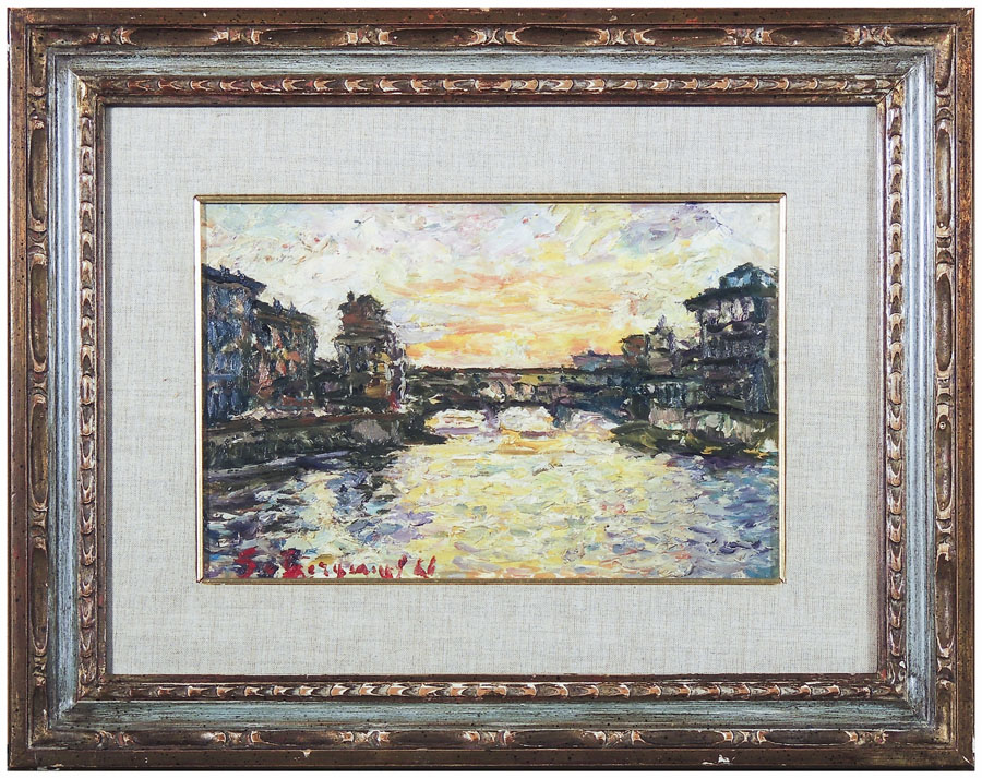 GUIDO BORGIANNI (1915-2011) Veduta di Ponte Vecchio 1966 olio su faesite, firmato, al verso firmato e datato, in cornice cm 20x30 PONTE VECCHIO VIEW, OIL ON FAESITE