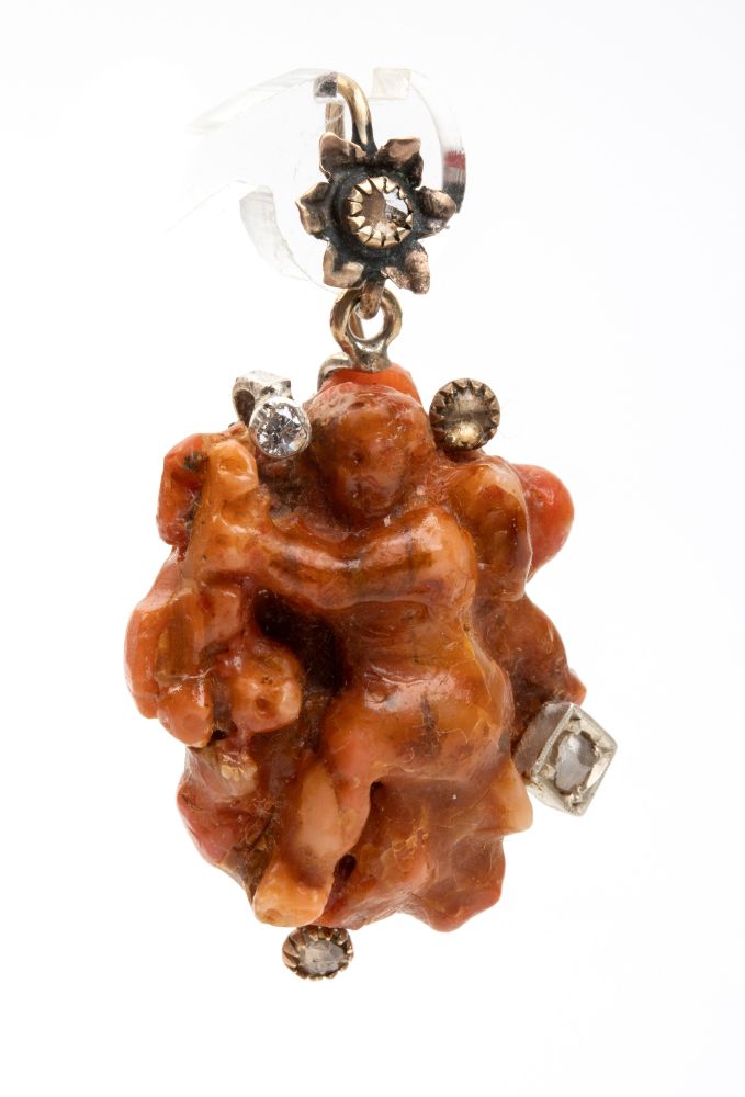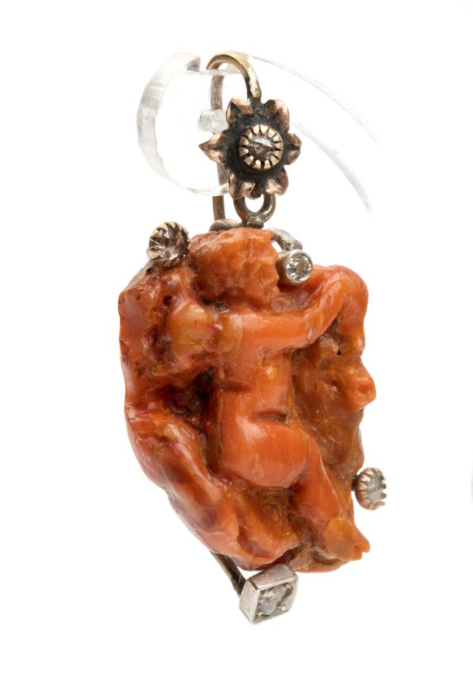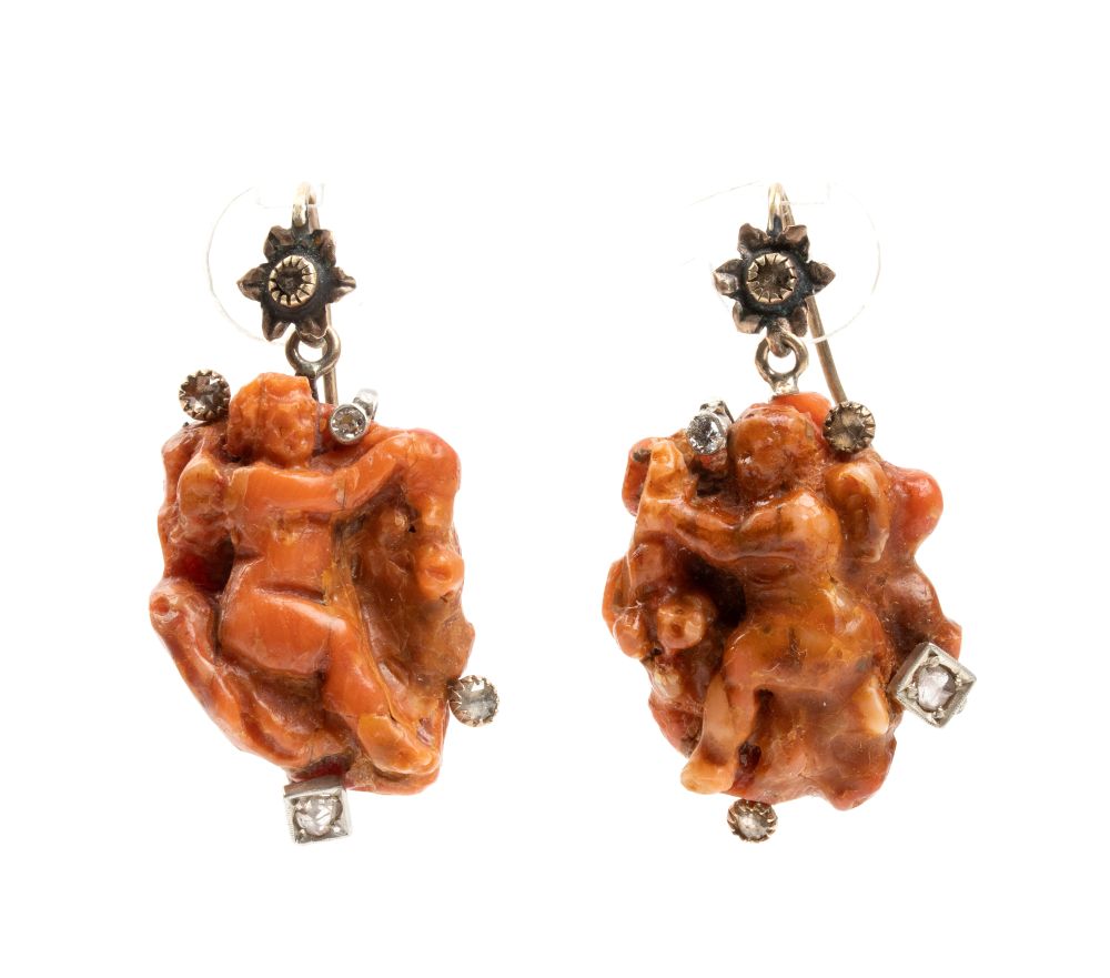 ciascuno raffigurante un profilo di putto alato scolpito in corallo Mediterraneo (Corallium Rubrum), montaggio in oro bianco ed oro giallo con punteggiature di diamanti.