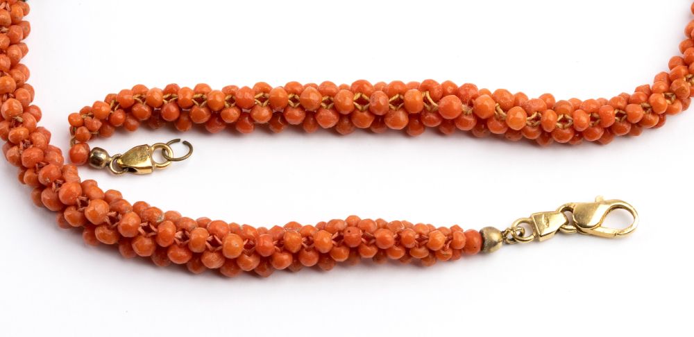 The lot is in a good state of preservation with normal signs of use over time. It needs to be re-threaded a part of the row of the coral that broke off.