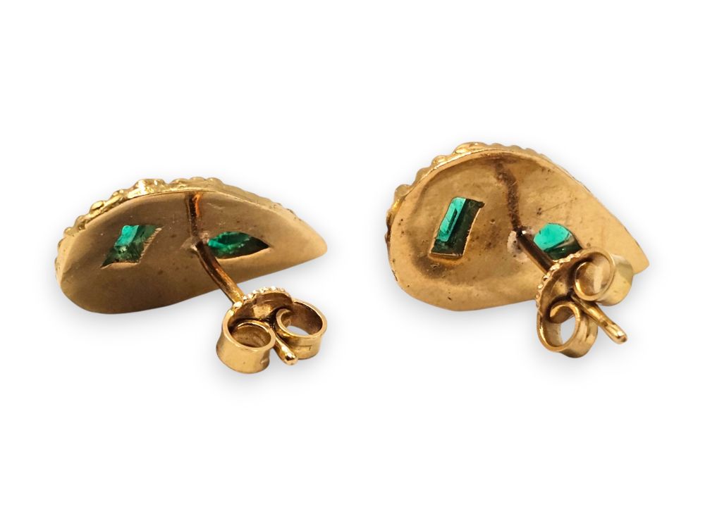 ciascuno a forma di scudo in oro giallo 18k, incastonato con coppia di smeraldi.