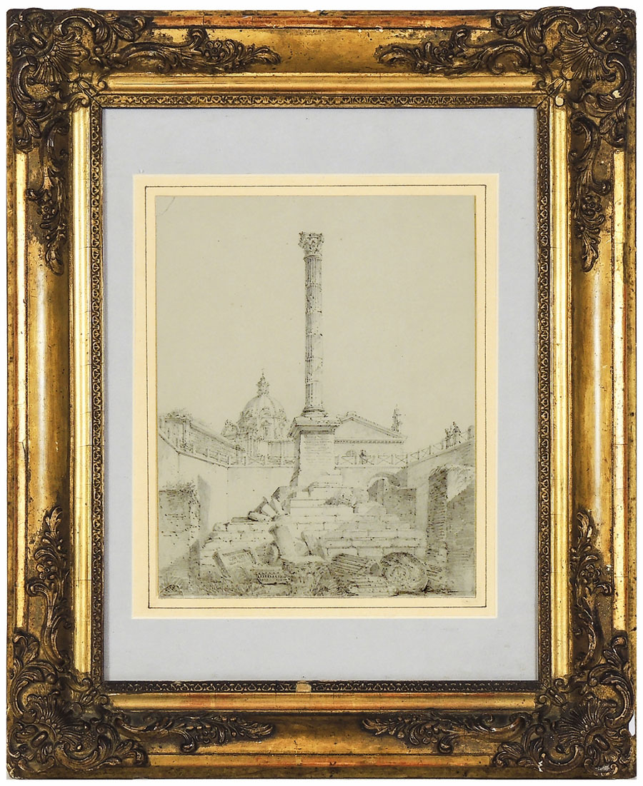 COLONNA DELL'IMPERATORE FOCA NEL FORO ROMANO metà del XIX secolo matita su carta, in cornice alcuni difetti cm 21,5x17 THE COLUMN OF EMPEROR PHOCA IN THE ROMAN FORUM, MID 19TH CENTURY, PENCIL ON PAPER