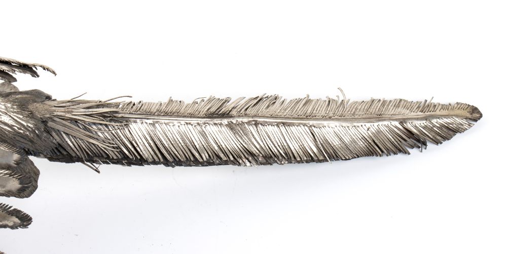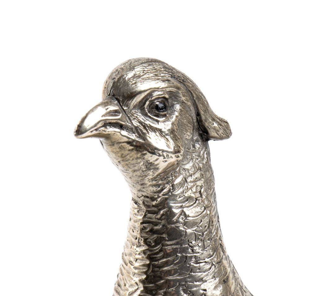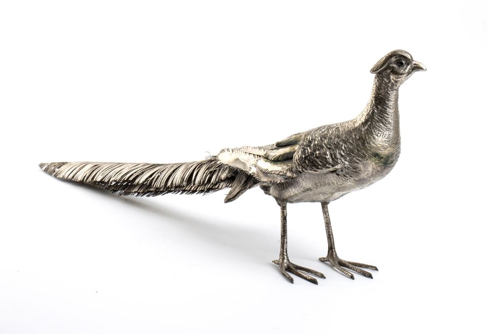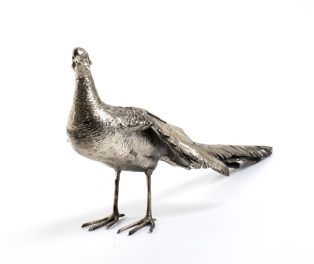 Fagiano in argento Italia, XX secolo Altezza x larghezza x profondità: 17,5 x 13 x 38 cm. Peso: 1010 gr.