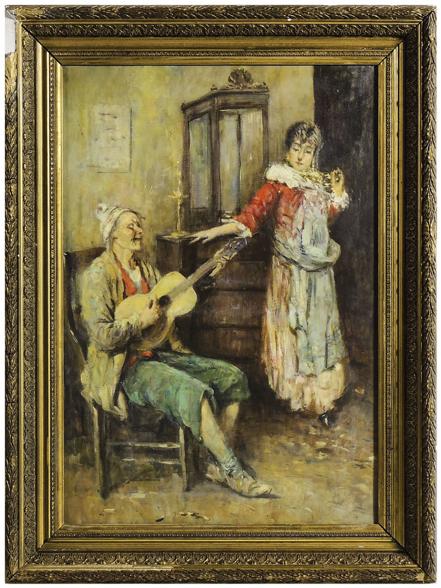 SCENA D'INTERNO CON PERSONAGGI olio su tela, in cornice, cm 56x38 INTERIOR VIEW WITH FIGURES, OIL ON CANVAS