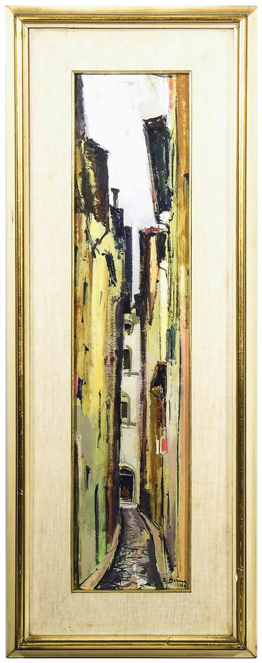 RODOLFO MARMA (1923-1999) Via Sguazza 1960 olio su faesite, firmato e datato, al verso firmato, titolato e datato, in cornice, cm 64x15,5 FLORENCE VIEW, OIL ON FAESITE