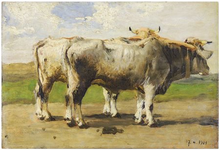 LORENZO DELLEANI (1840-1908) Buoi piemontesi 1901 olio su tavoletta, datato 17.4.1901, in cornice cm 31,8x45 Al verso reca iscritto a penna: ''ex proprietà Sofia di Bricherasio/ via Lagrange 20 […]/ Torino; reca altra iscrizione: ''Buoi piemontesi''; reca timbro di autenticazione con firma ''Bistolfi'' Bibliografia - Literature: XVI Esposizione Internazionale d’Arte della città di Venezia. Venezia: 1928, p 38, n 79; U. Ojetti, La pittura italiana dell’Ottocento. Milano-Roma: 1929, p 61, tav 73; A. e J. Dragone Conti, I paesisti piemontesi dell’Ottocento. Milano: 1947, p 255; A. Dragone, Delleani. La vita e l’opera. vol. II, n 1619 (del repertorio cronologico delle opere). Provenienza - Provenance: Sofia di Bricherasio, Torino Il dipinto, oltre a essere tipica espressione della produzione di Delleani di primo Novecento, era appartenuto a Sofia di Bricherasio, divenendo così ulteriore testimonianza degli stretti rapporti che l’artista aveva instaurato la contessa, della quale era stato anche maestro. Del circolo artistico e culturale della contessa di Bricherasio faceva parte anche il celebre scultore Leonardo Bistolfi, che firma l’autentica di quest’opera CATTLE, OIL ON PANEL, WITH STAMP AND INSCRIPTIONS ON REVERSE