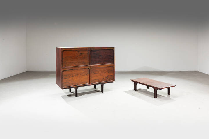 Mobile credenza con struttura in legno e scomparti a serrandina; e tavolino in legno.
