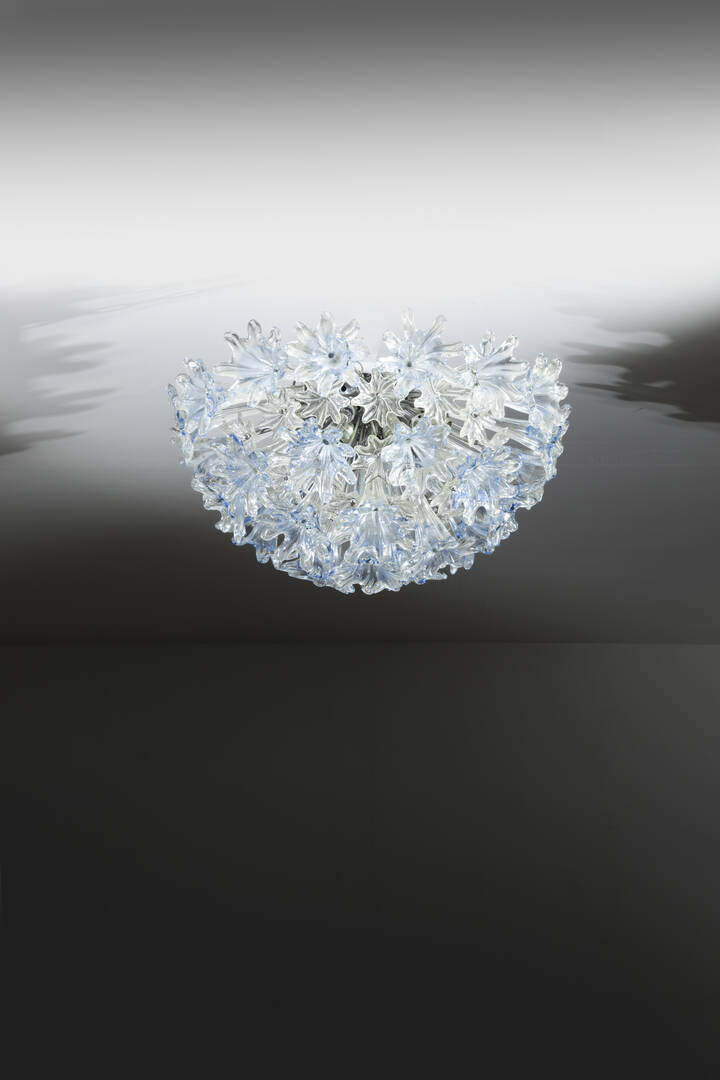 Struttura in metallo cromato ed elementi diffusori in vetro di Murano.
