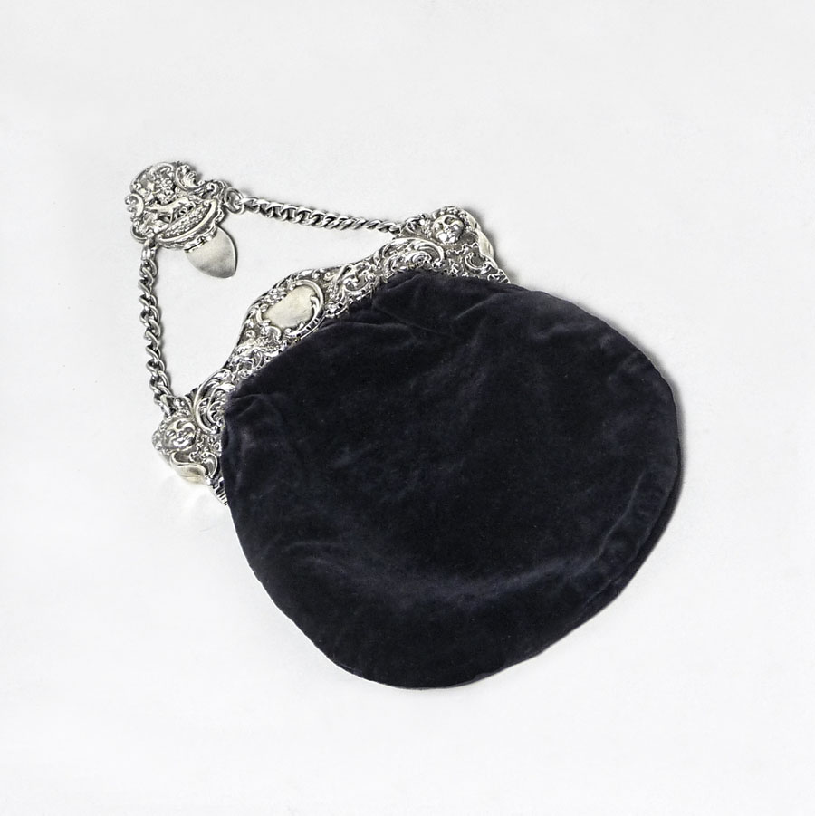 BORSETTA IN VELLUTO NERO E ARGENTO Chester, 1899 fermezza in argento sbalzata con volute, motivi floreali e mascheroni, piccola mancanza BLAK VELVET AND SILVER HANDBAG, CHESTER, 1899