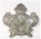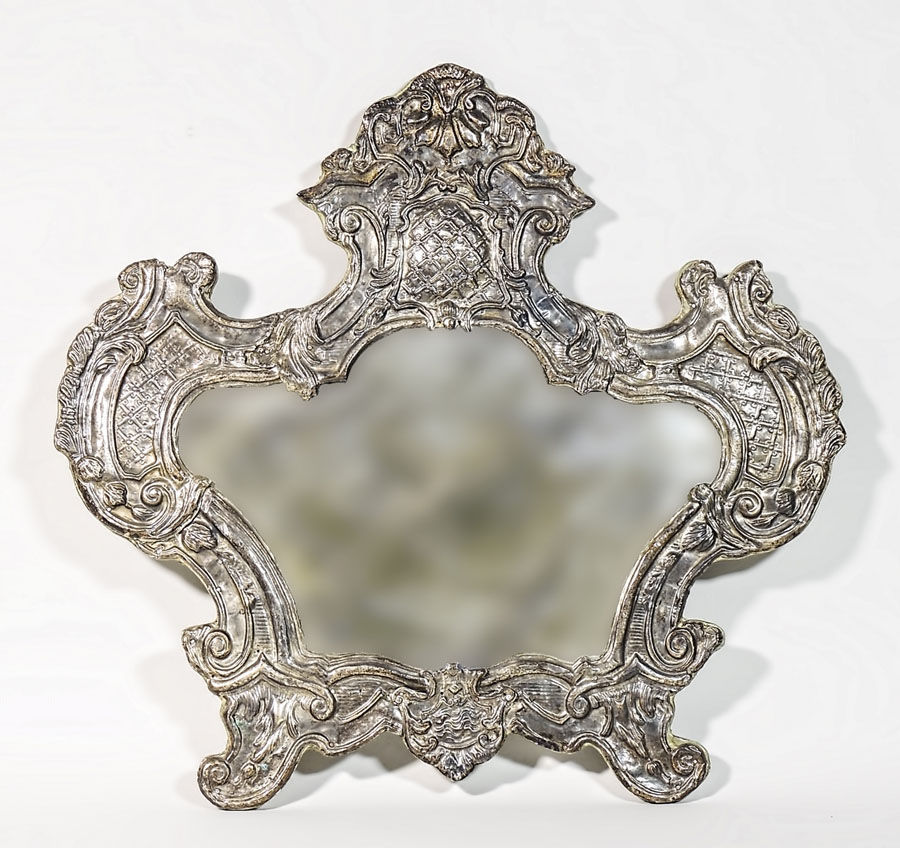 CARTAGLORIA RIVESTITA IN RAME ARGENTATO Italia, XVIII secolo cornice sagomata sbalzata con volute e foglie d'acanto, cimasa centrata da conchiglia, piedini a ricciolo, montata a specchio, cm 52x53,5 SILVERED COPPER ALTAR CARD, ITALY, XVIII CENTURY