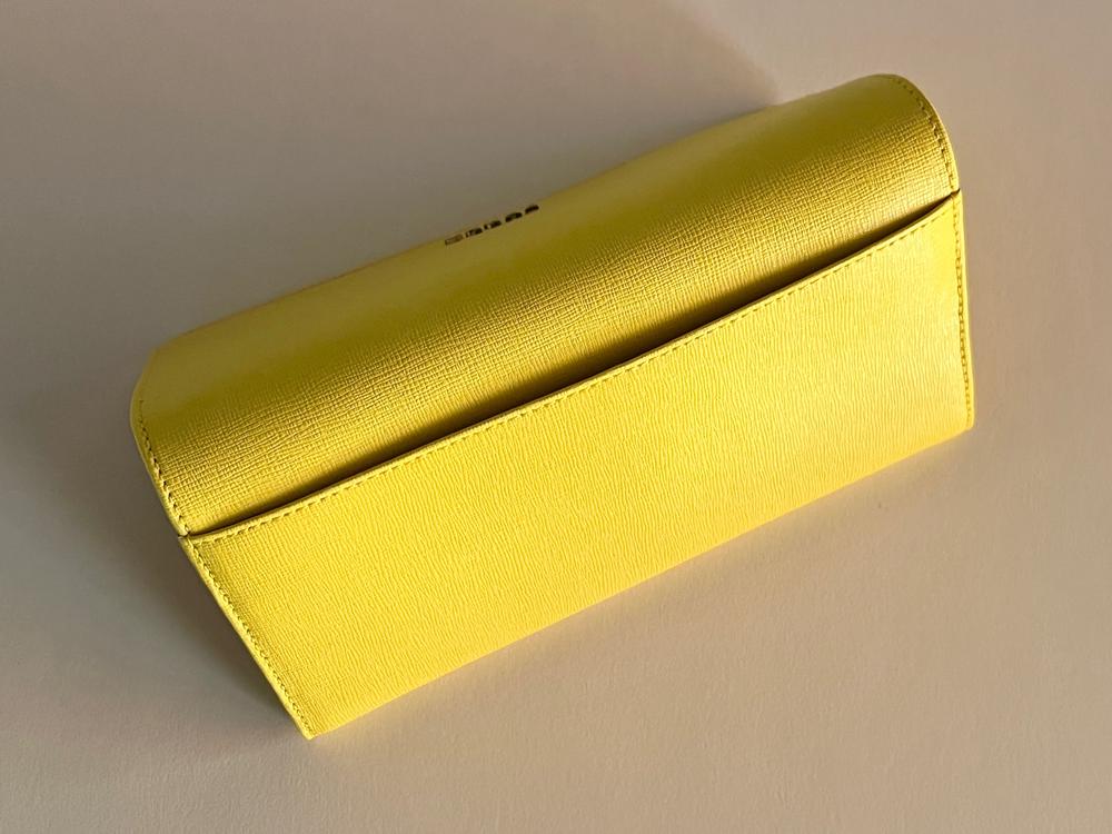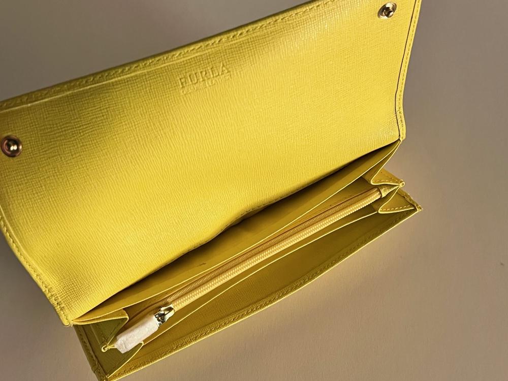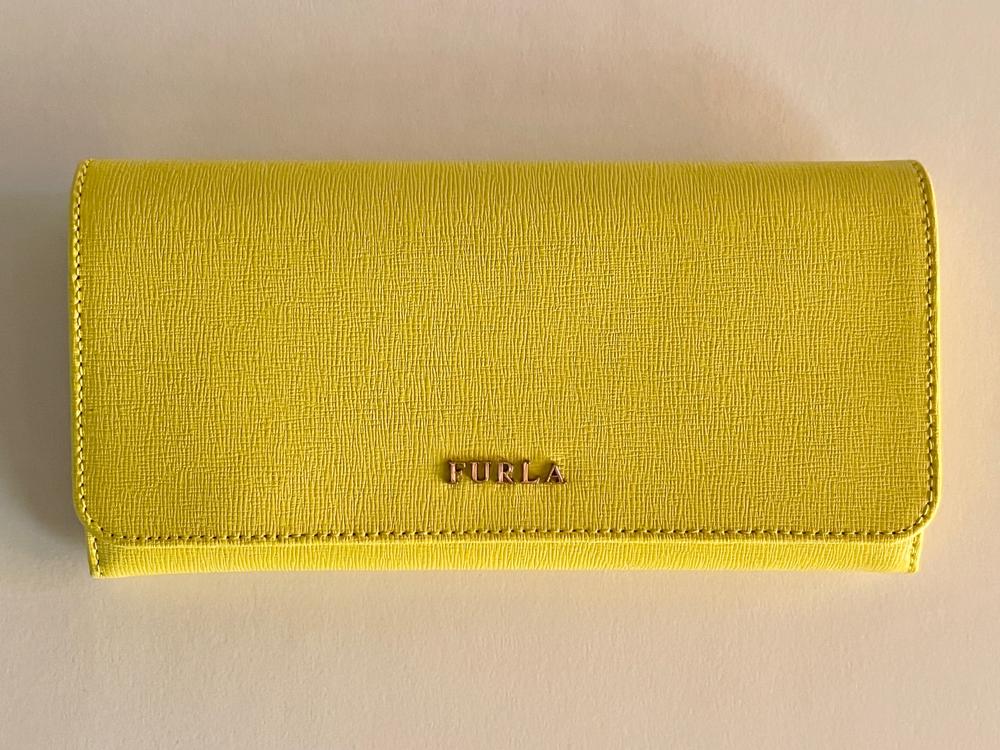 Furla Babylon XL Bifold Wallet in Sunny. Two note compartments, twelve card slots, three flat pockets and one middle zip-compartment for loose change characterize the Furla Babylon. One additional pocket is available at the back of this leather wallet. The flap of this women's wallet with metal lettering is snap-secured. Brand new with tags in original box with dustbag