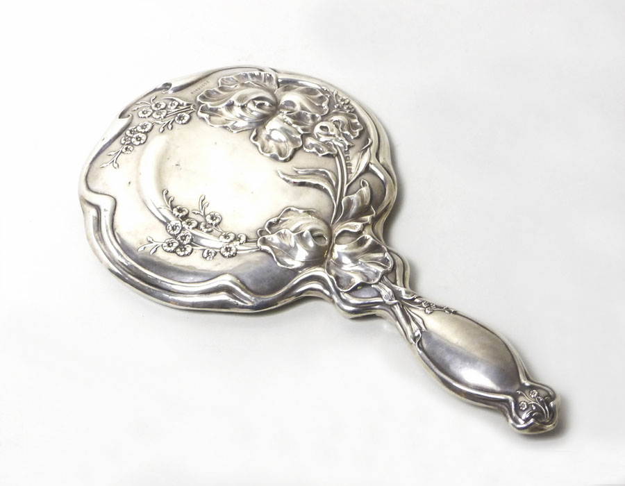 SPECCHIO DA TOILETTE IN ARGENTO Birmingham, 1907 sbalzato con motivi floreali e foglie di gusto Liberty SILVER TOILET MIRROR, BIRMINGHAM, 1907