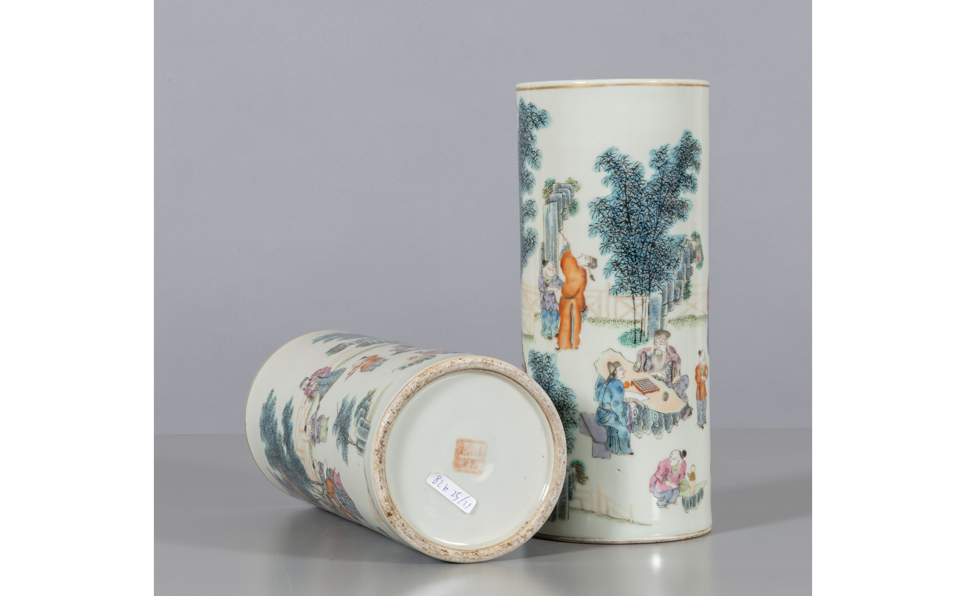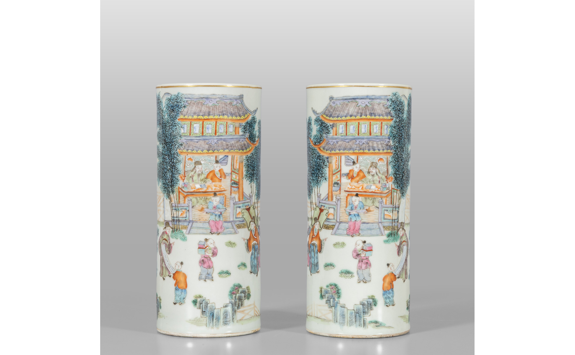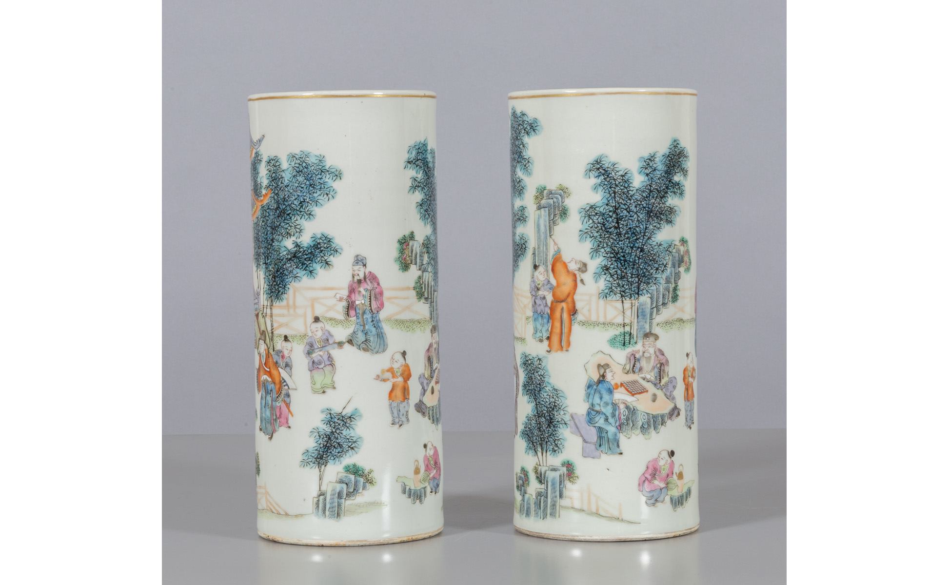 Coppia di vasi in porcellana famiglia Verde decorati con saggi e bambini marcati alla base Cina