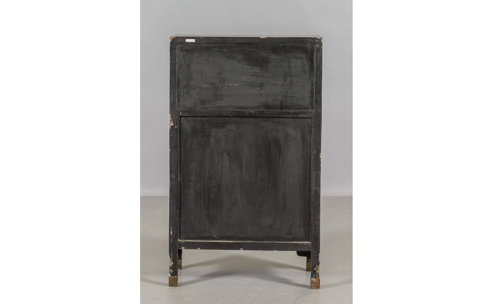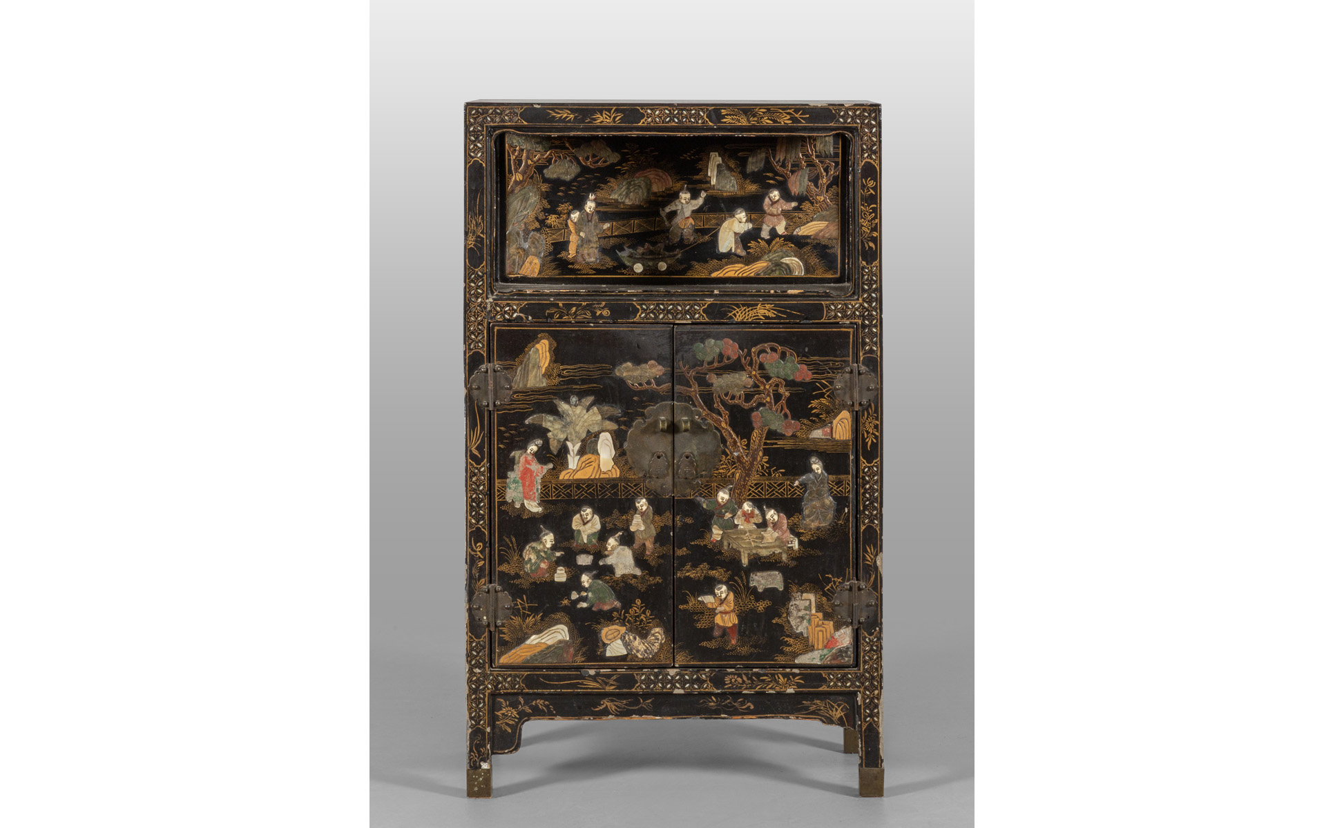 Piccolo armadio a due ante laccato a fondo nero con scene di vita orientale in pietre dure e teste in avorio Cina fine sec.XIX