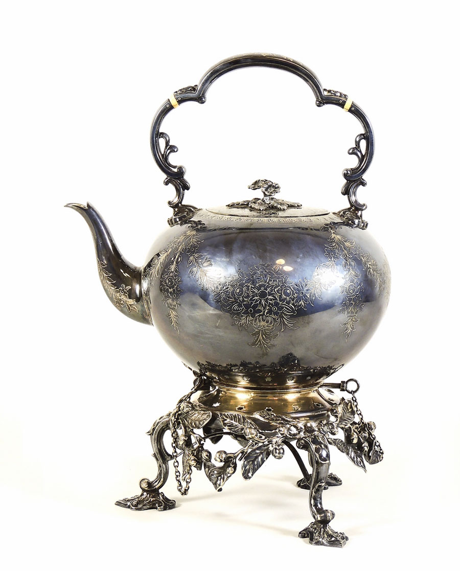 SAMOVAR IN SHEFFIELD Inghilterra, Thomas Bradbury & Sons, 1880 circa manico sagomato, corpo globulare finemente sbalzato e cesellato con motivi di festoni floreali, poggiante su base sbalzata con motivi vegetali h cm 40 SHEFFIELD SAMOVAR, ENGLAND, THOMAS BRADBURY & SONS, 1880 CIRCA