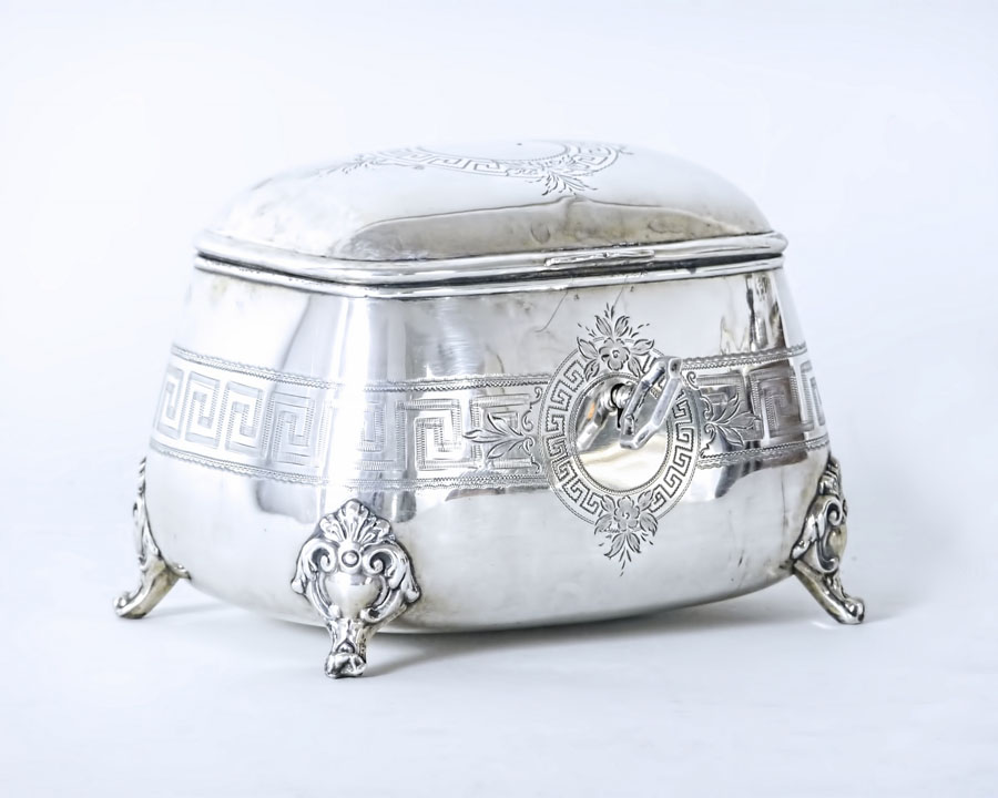di forma squadrata, inciso con motivo a greca e rosoni, su quattro piedini a ricciolo, lieve difetto