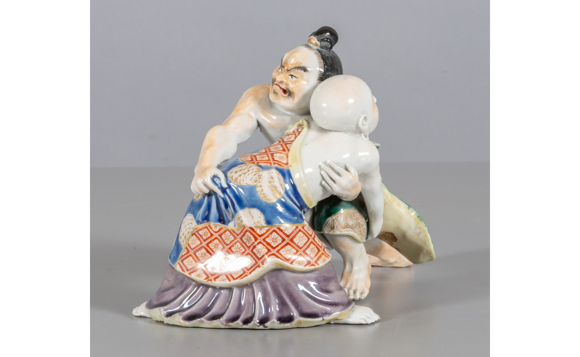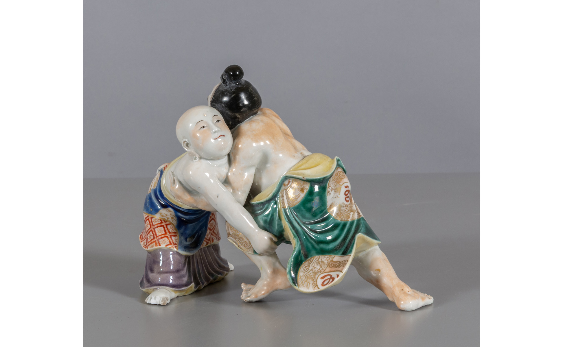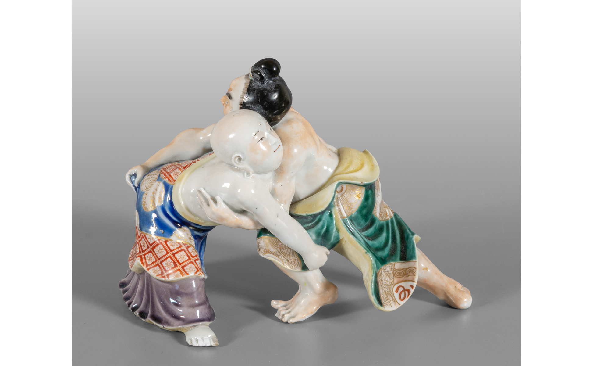 Lottatori di sumo gruppo in porcellana policroma Giappone sec.XIX