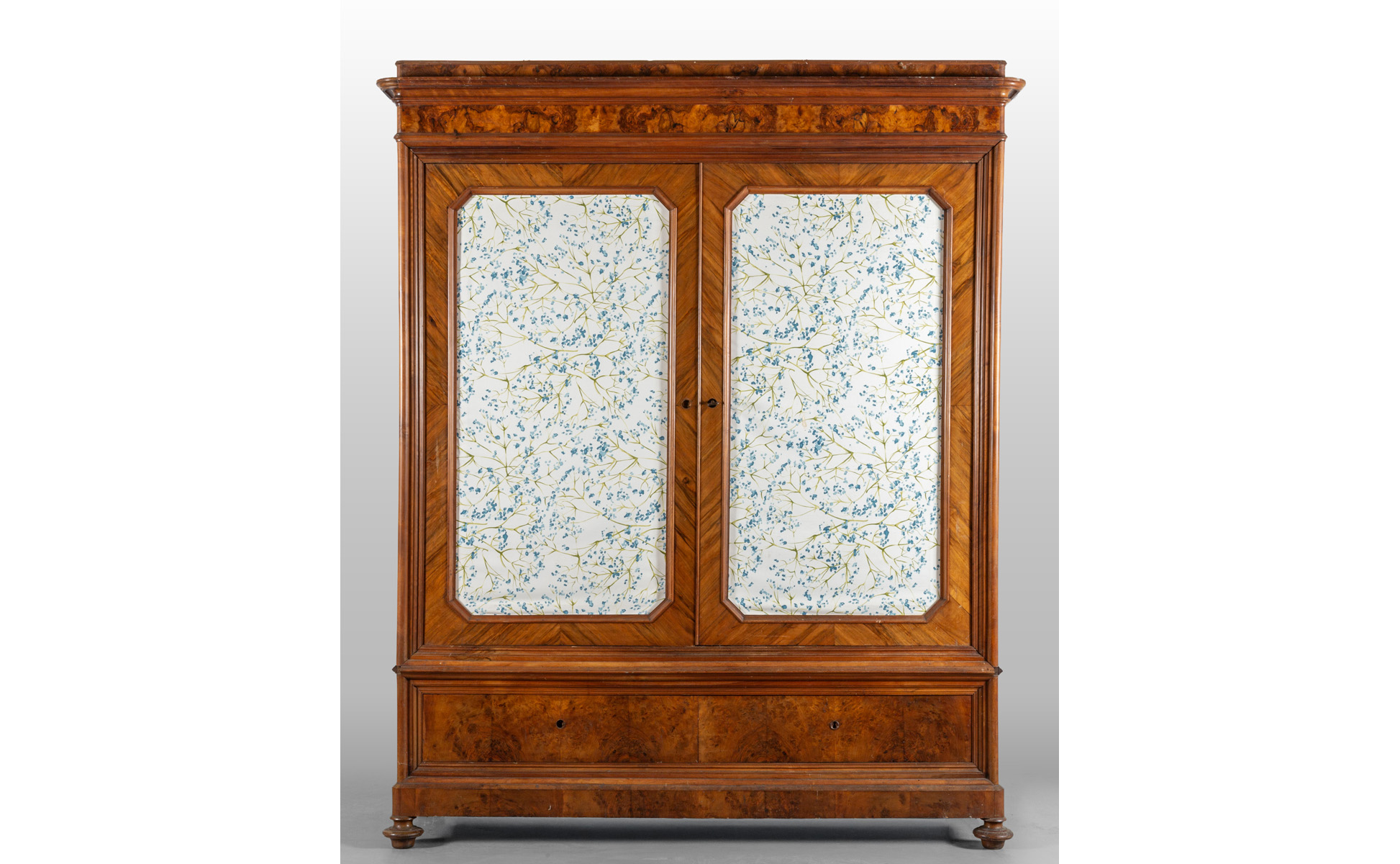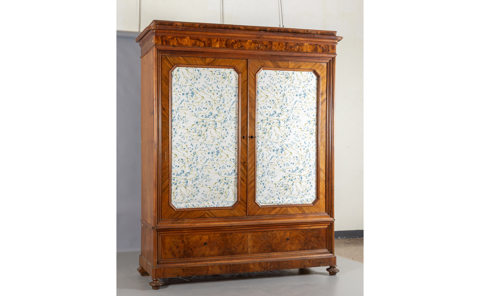 Armadio lastronato in radica a due sportelli e due cassetti sec.XIX