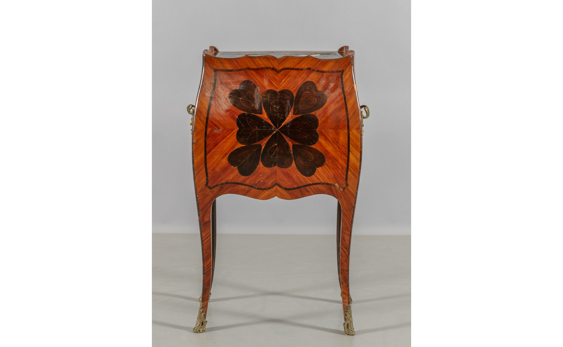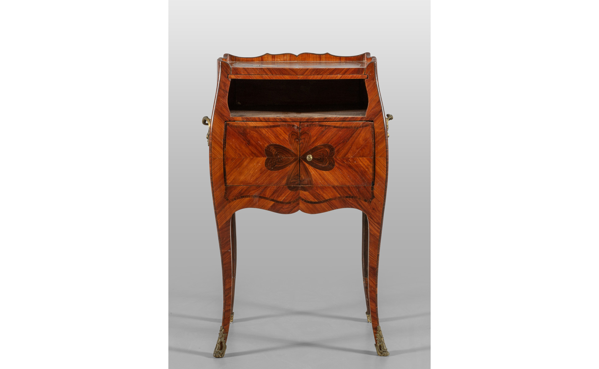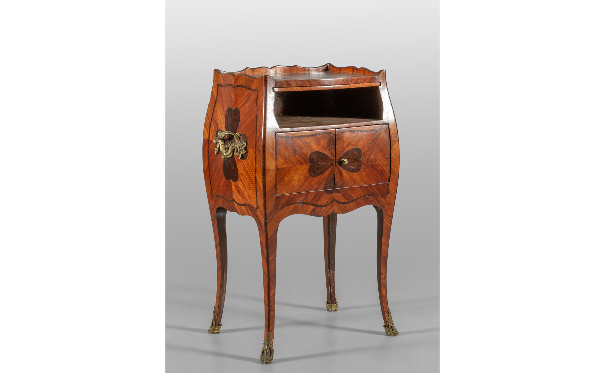 Comodino di forma mossa lastronato in palissandro ed intarsiato con il motivo del cuore in violetto Genova sec.XIX