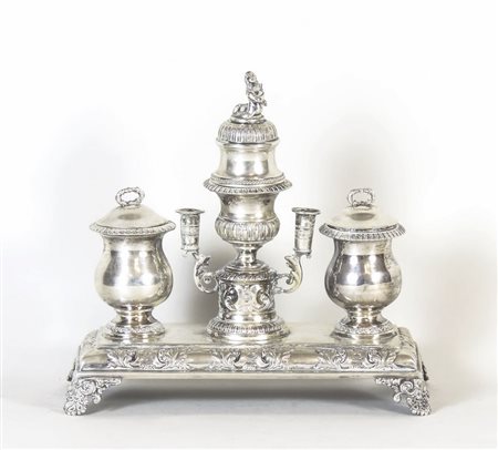 CALAMAIO IN ARGENTO Milano, Tommaso Panizza, prima metà del XIX secolo sbalzato con foglie d'acanto, completo di campanella con presa modellata come una sirena, piedini a ricciolo, mancanza gr 320 SILVER INKSTAND, MILAN, TOMMASO PANIZZA, FIRST HALF OF 19TH CENTURY