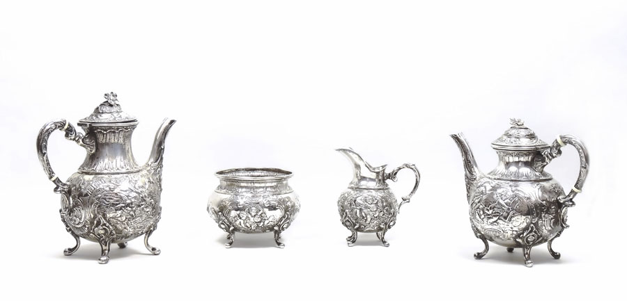 SERVITO DA TE E CAFFÈ IN ARGENTO Germania, fine del XIX secolo coperchi con presa modellata come un fiore, manici a doppia voluta, corpi riccamente sbalzati con volute e puttini musicanti entro riserve sagomate, composto da teiera, caffettiera,lattiera e zuccheriera gr 2365 (4) SILVER TEA AND COFFEE SET, GERMANY, LATE 19TH CENTURY
