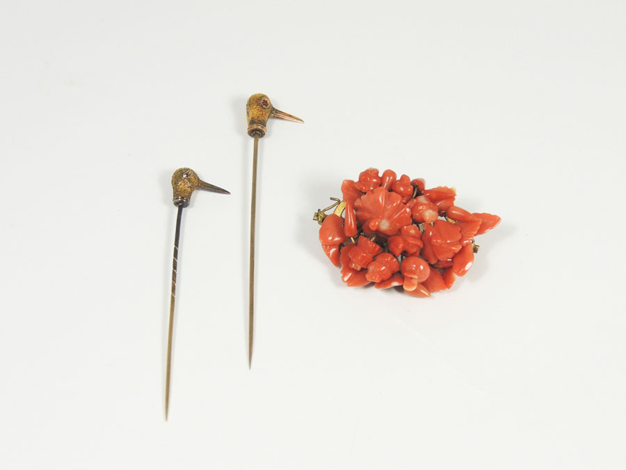 LOTTO due spille per cravatta in oro di diverse carature ed una spilla in corallo rosso (3)