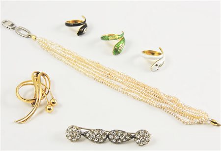 LOTTO piccola spilla a barretta impreziosita da pietre sintetiche taglio brillante; una spilla biujoux; tre anelli in oro e smalti verde, nero e bianco, ciascuno realizzati come un serpente impreziosito da piccoli diamanti, lievi difetti; un bracciale in microperle (6) GOLDEN JEWELS LOT