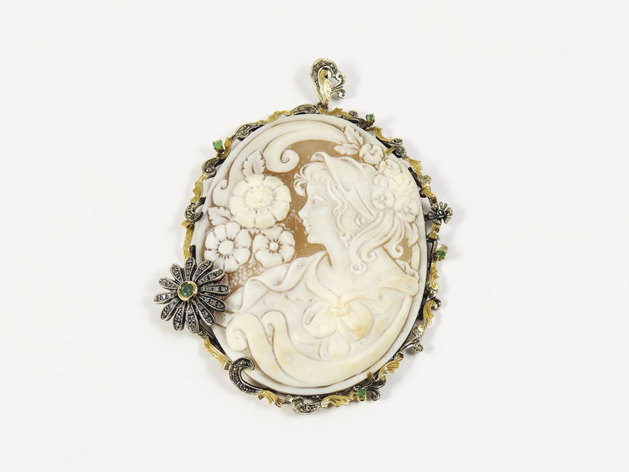 PENDENTE IN ARGENTO STERLING con grande cammeo in conchiglia impreziosito da smeraldi e diamanti LARGE SHELL CAMEO MOUNTED IN SILVER WITH SMALL EMERALDS AND DIAMONDS