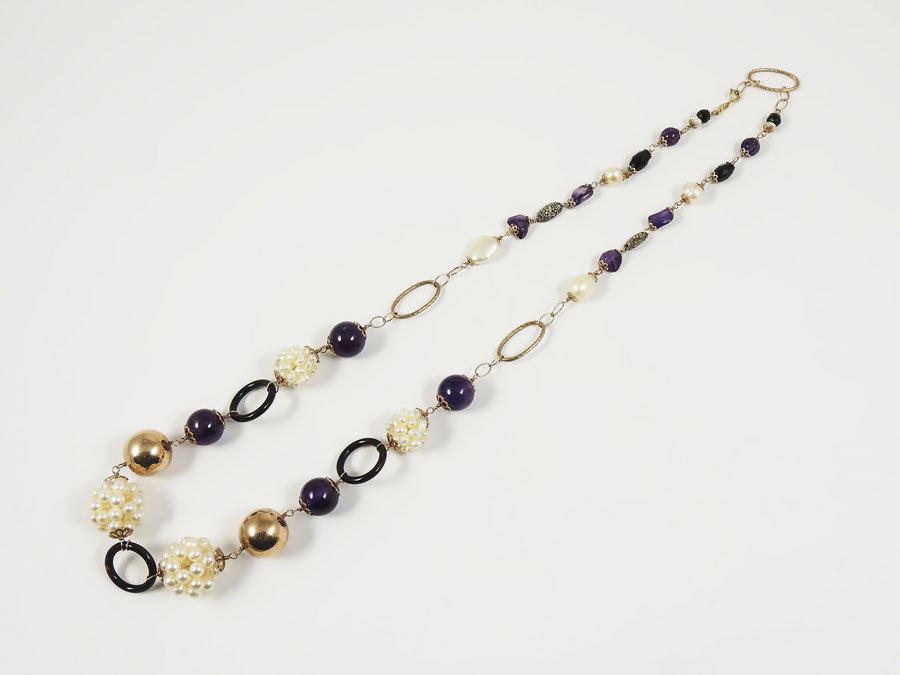 COLLANA IN ORO GIALLO, ARGENTO, QUARZI AMETISTA, ONICE E PERLE DI ACQUA DOLCE realizzata a maglia fantasia degradè lung cm 70 circa AMETHISTS, ONYX AND FRESH WATER PEARLS GOLD AND SILVER NECKLACE