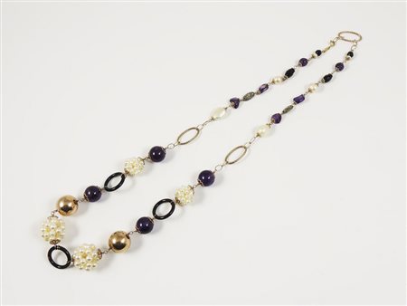 COLLANA IN ORO GIALLO, ARGENTO, QUARZI AMETISTA, ONICE E PERLE DI ACQUA DOLCE...