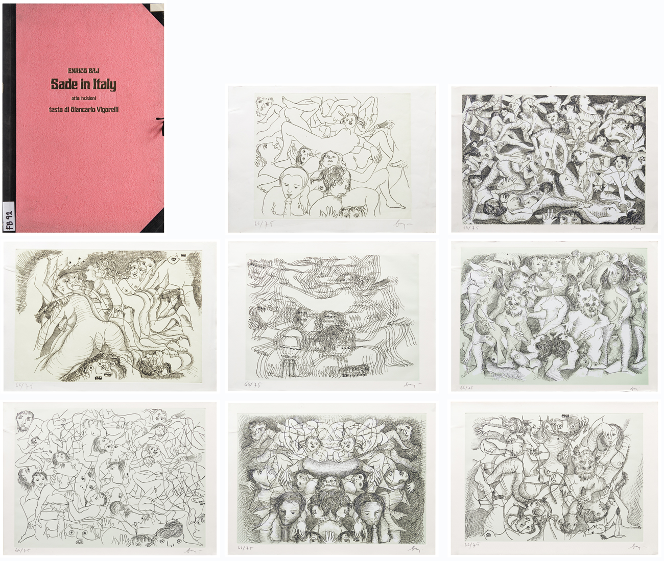 Si tratta della serie completa - otto tavole - predisposta da Enrico Baj nel 1976 in 75 esemplari per celebrare il viaggio in Italia del Marchese de Sade, avvenuto duecento anni prima, tra il luglio 1775 e il giugno 1776. L’opera è introdotta da un testo di Giancarlo Vigorelli.