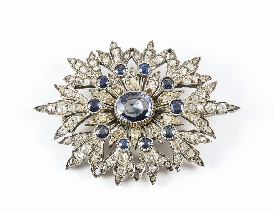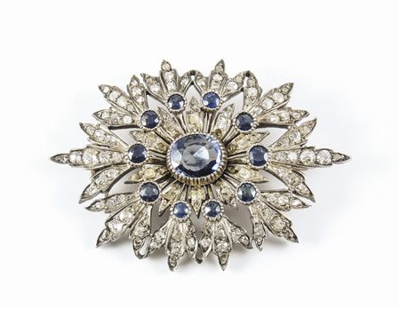 SPILLA IN ORO, ARGENTO, ZAFFIRI E DIAMANTI inizio del XX secolo impreziosita da zaffiro ovale centrale cts 2,50 circa, gr 25,5 OLD GOLD AND SILVER BROOCH WITH SAPPHIRES AND DIAMONDS