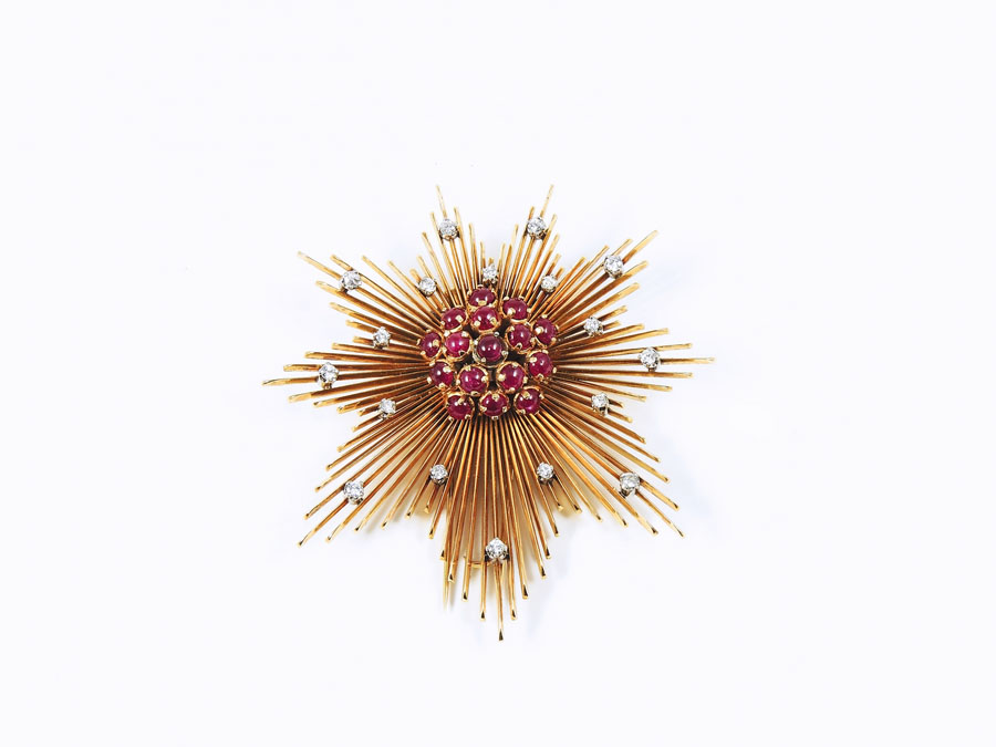 SPILLA IN ORO ROSSO, RUBINI CABOCHON E DIAMANTI Anni Quaranta realizzata come una stella, alcuni restauri a stagno gr 53,6 RED GOLD, RUBIES AND DIAMONDS BROOCH, FORTIES