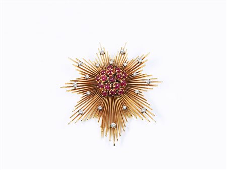 SPILLA IN ORO ROSSO, RUBINI CABOCHON E DIAMANTI Anni Quaranta realizzata come...