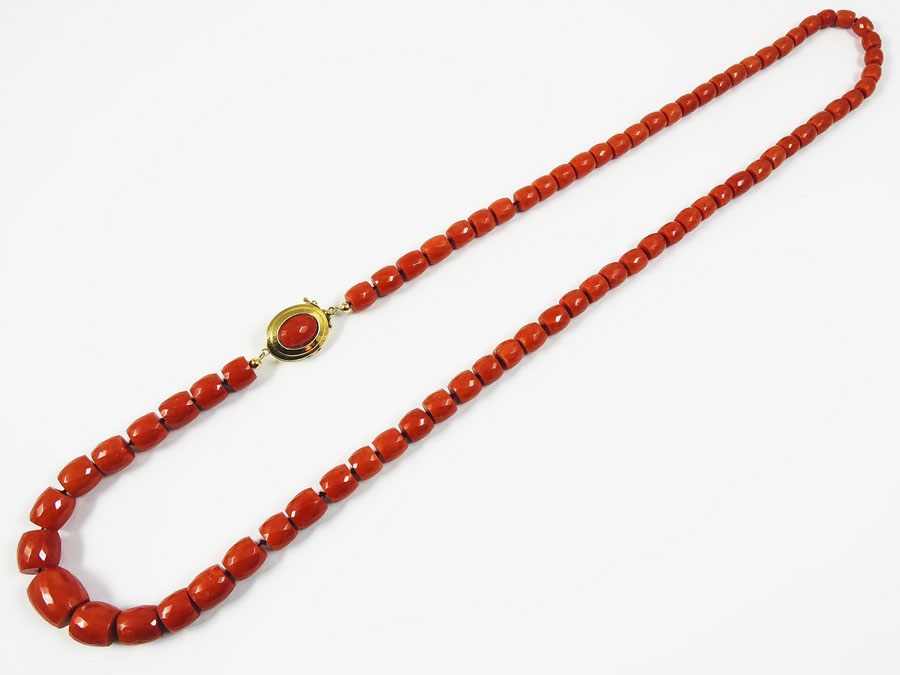 COLLANA DEGRADÉ IN CORALLO ROSSO fermezza in oro giallo e cabochon in corallo, chicchi a barilotto sfaccettato lungh cm 80, diam barilotti 10/13,5, gr 105,3 RED CORAL NECKLACE