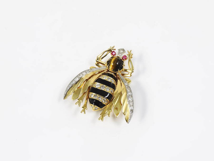 SPILLA ANIMALIER IN ORO GIALLO, ONICE, OCCHIO DI TIGRE, DIAMANTI E SMALTI realizzata come un'ape diamanti cts 3,50 circa, gr 30,8 BEE SHAPED GOLD BROOCH