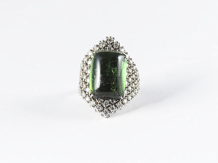ANELLO A MAGLIA MORBIDA IN ORO GIALLO, ORO BIANCO, TORMALINA CABOCHON E DIAMANTI tormalina verde cts 15 ca, diamanti cts 2,50 ca, gr 17,6 GREEN TOURMALINE AND DIAMONDS WHITE AND YELLOW GOLD RING