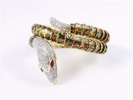 BRACCIALE ANIMALIER IN ORO GIALLO, SMALTI E DIAMANTI realizzato come un serpente, corpo a squame multicolori, testa e coda in pavè di brillanti diamanti cts 4,0 circa, gr 149 SNAKE SHAPED BRACELET IN YELLOW GOLD, ENAMEL AND DIAMONDS