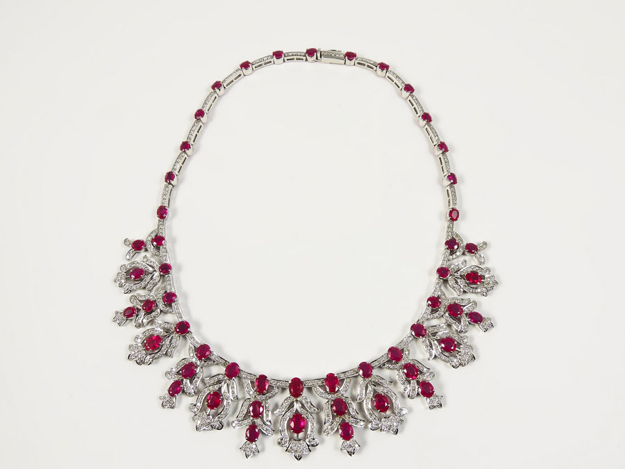 COLLIER IN ORO BIANCO, DIAMANTI E RUBINI Anni Novanta rubini cts 27 circa, diamanti cts 5,50 circa, gr 78,4 RUBIES AND DIAMONDS WHITE GOLD NECKLACE