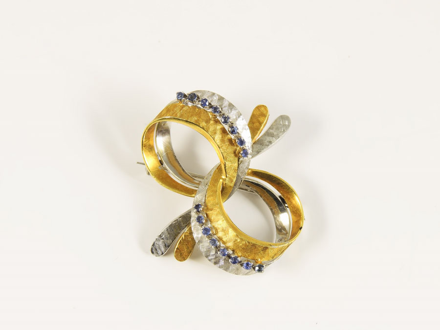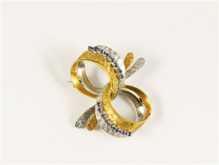 SPILLA IN ORO GIALLO, ORO BIANCO SATINATO E ZAFFIRI Anni Sessanta realizzata come un fiocco gr 11,6 YELLOW AND WHITE GOLD BROOCH