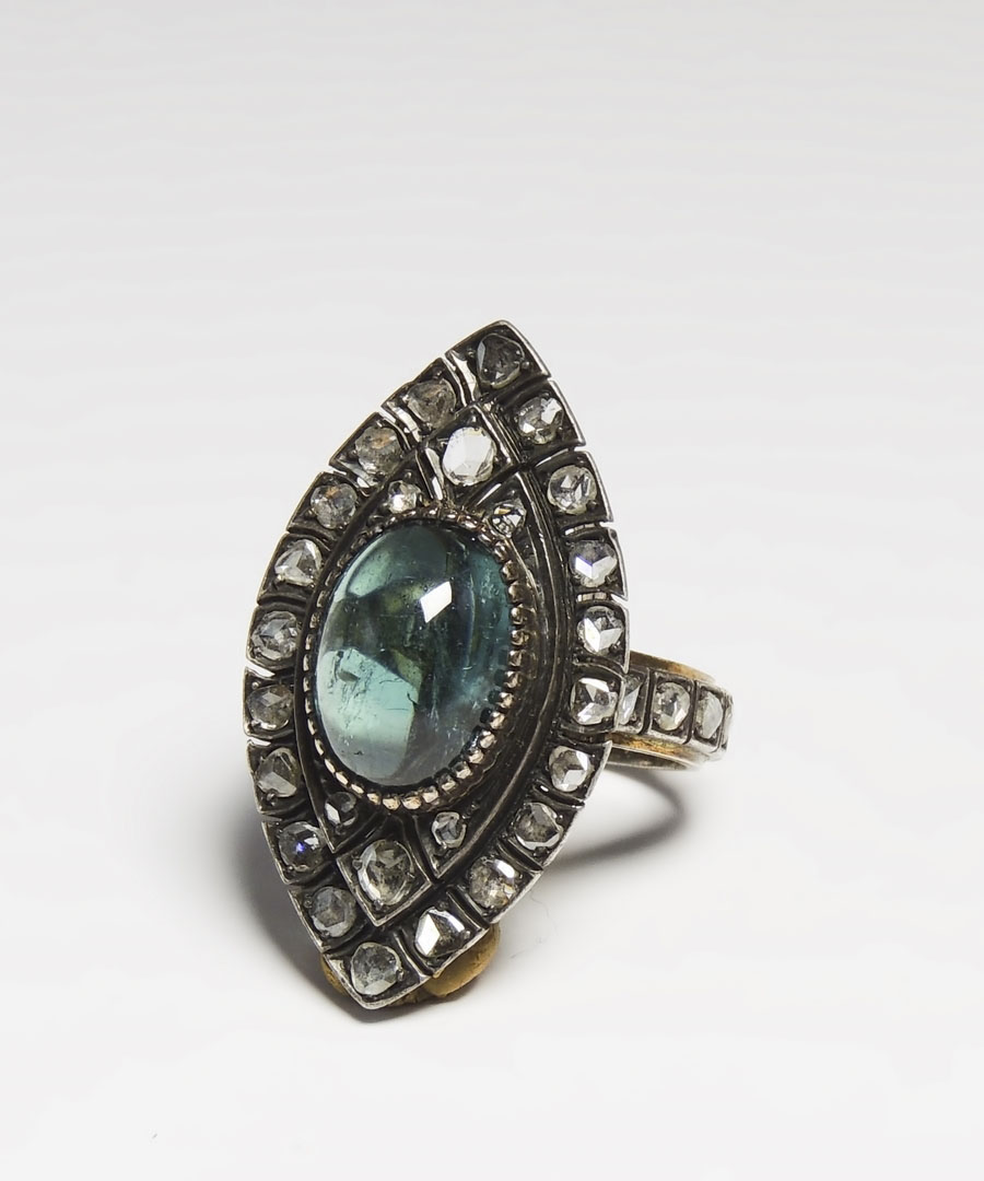 ANELLO IN ORO E ARGENTO, TORMALINA E ROSE DI DIAMANTE realizzato in stile antico tormalina indicolite cabochon cts 9 circa, gr 12,40 TOURMALINE AND ROSE DIAMONDS OLD STYLE GOLD AND SILVER RING