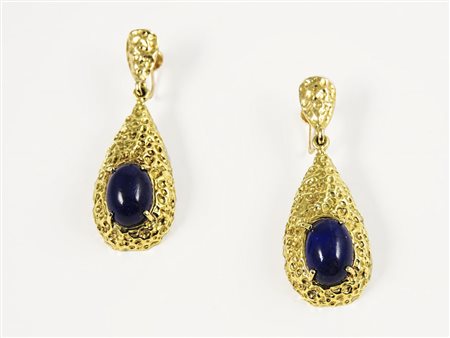 PAIO DI ORECCHINI IN ORO CESELLATO E LAPISLAZZULI CABOCHON realizzati come due grandi gocce gr 20,3 Lapis lazuli and yellow gold earrings