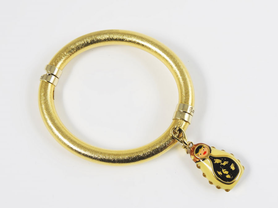 BRACCIALE RIGIDO IN ORO GIALLO SATINATO Rosato con charm in smalti, realizzato come una matrioska gr 23,2 YELLOW GOLD BANGLE WITH ENAMEL PENDANT