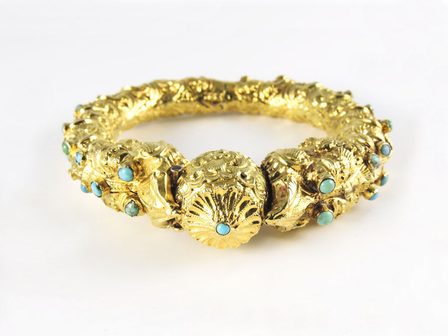 BRACCIALE IN ORO GIALLO E TURCHESI India varie leghe dell'oro, gr 46,1 INDIAN YELLOW GOLD AND TURQUOISE BRACELET