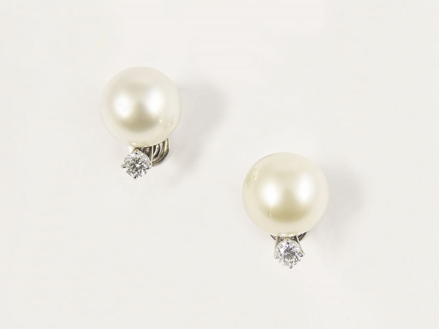 PAIO DI ORECCHINI IN ORO BIANCO, PERLE COLTIVATE SOUTH SEA impreziosite da un brillante ciascuno perle diam mm 17,5 circa, diamanti cts 1,10 circa complessivi SOUTH SEA PEARLS AND DIAMONDS EARRINGS