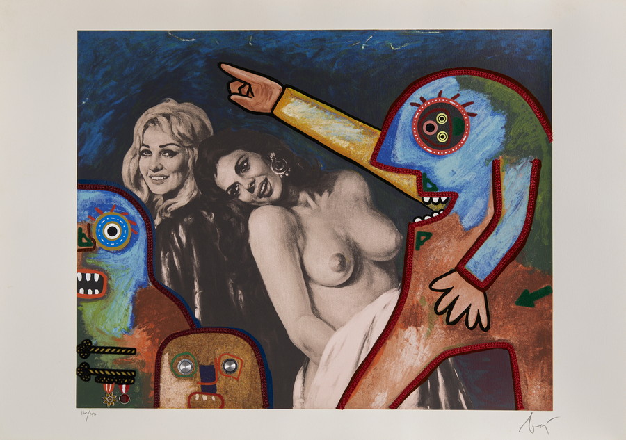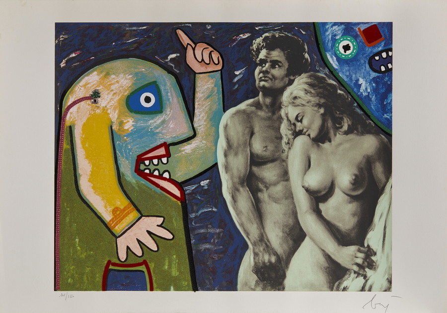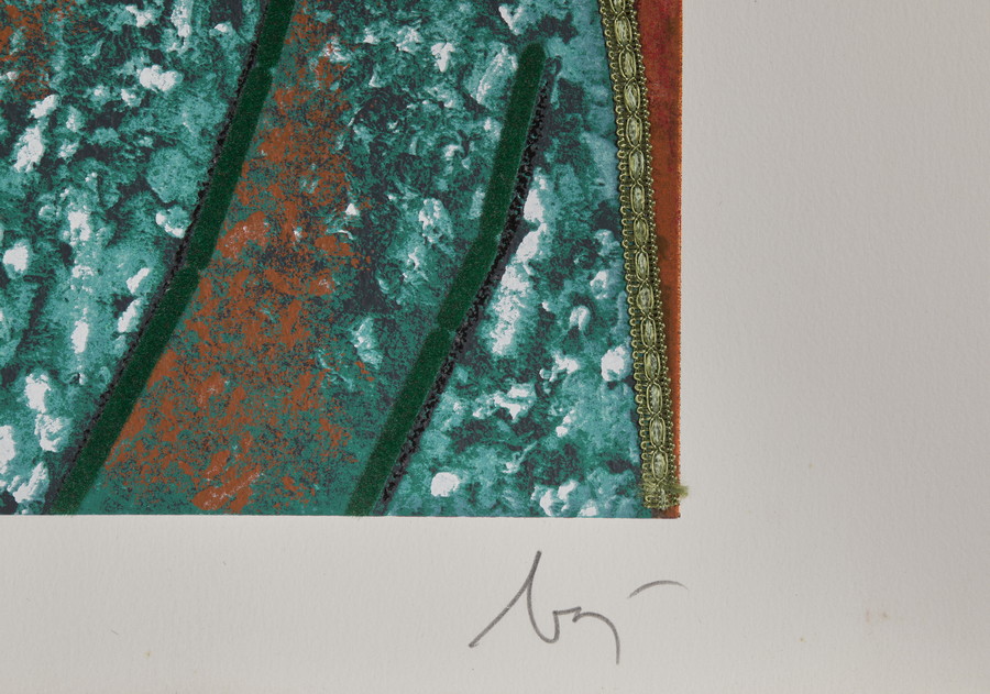 BAJ ENRICO (1924 - 2003) CARTELLA COMPOSTA DA N. 3 FOGLI. litografia a colori con collage di stoffa, spago e graffette. Cm 100,00 x 70,00. firma e tiratura a matita, es. 142/150