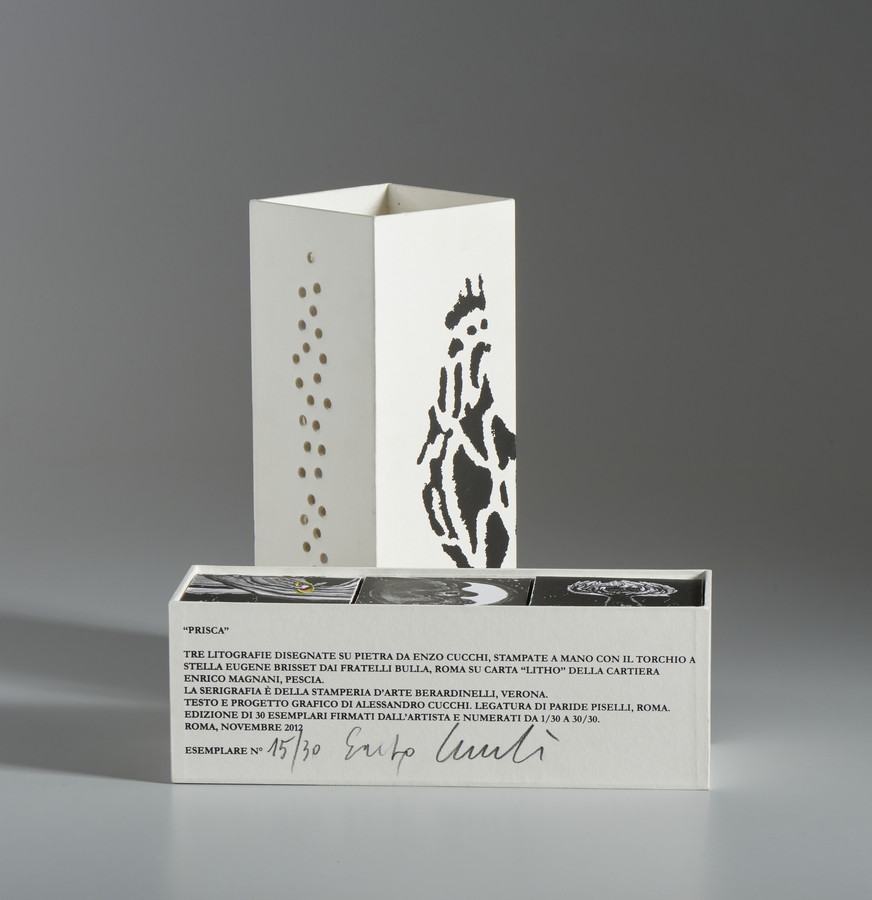 Tre litografie disegnate su pietra da Enzo Cucchi, stampate a mano con il torchio a stella Eugene Brisset dai f.lli Bulla, Roma su carta "litho2 della cartiera Enrico Magnani, Pescia.