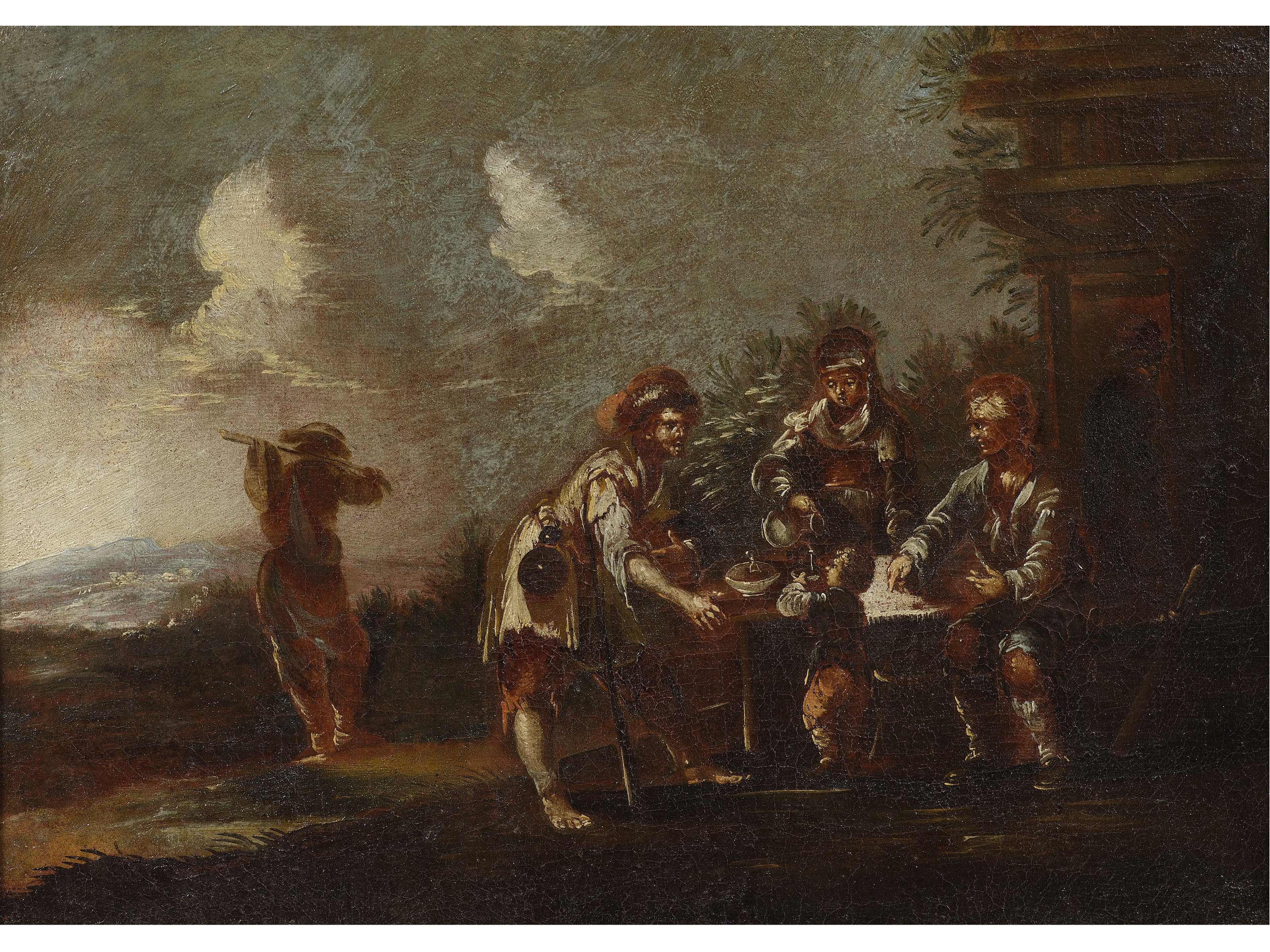 Scuola italiana (XVIII Secolo) Sosta alla locanda Olio su tela Cornice coeva 37.3x51 cm