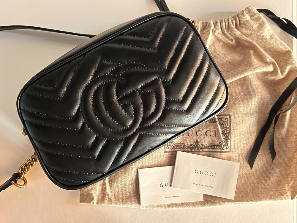 The mini GG Marmont chain shoulder bag has a softly structured shape and a zip top closure with Double G hardware. The chain shoulder strap has a leather shoulder detail. The camera bag is made in matelassé leather with a chevron design and GG on the back. Black matelassé chevron leather with GG on the back Antique gold-toned hardware Double G Interior open pocket Chain shoulder strap with 23.6" drop Zip top closure Weight: 1.2 lb approximately 7"W x 5"H x 2.5"D Made in Italy Fits iPhone Pro Max/Plus, Airpods, small wallet, and lipstick Microfibre lining with a suede-like finish
