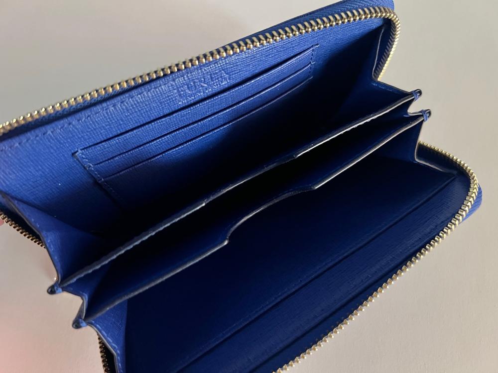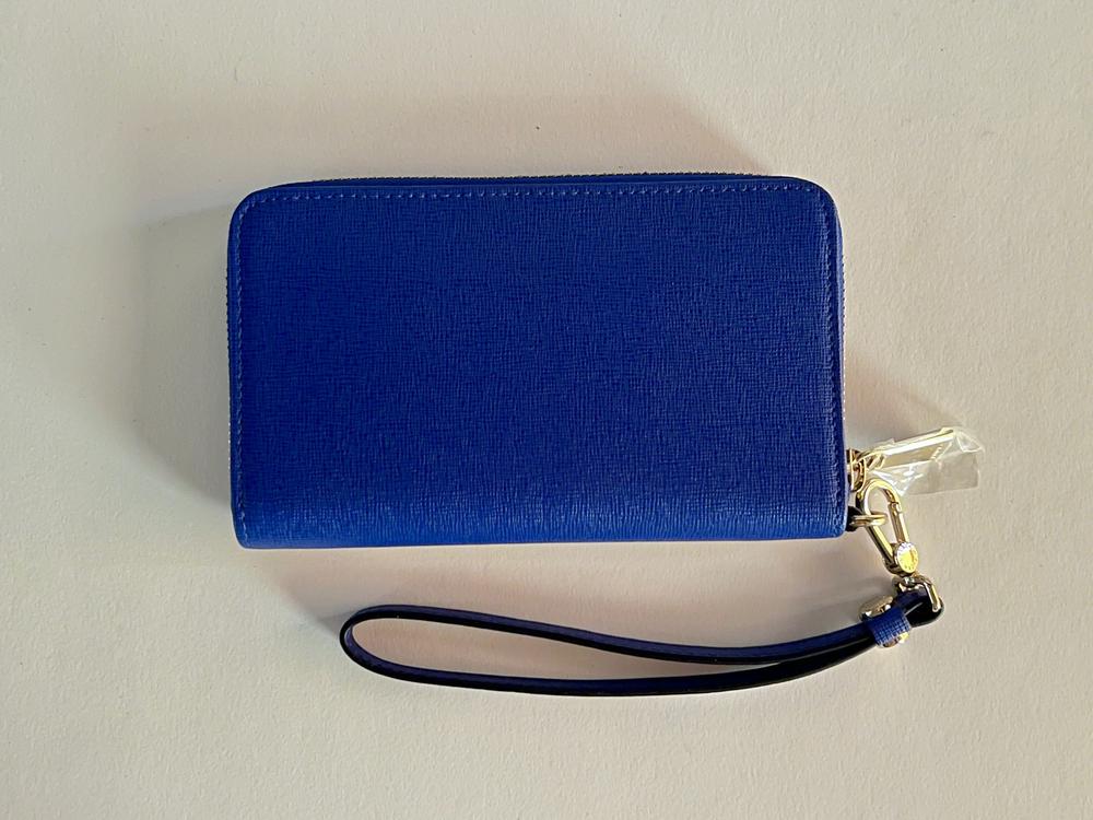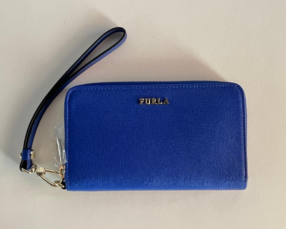 Furla Babylon zip around wallet/wristlet in Ocean leather. High quality embossed leather with 4 credit card slots, 3 separated inner compartments, and removable wrist strap. Brand new with tags in original box with dustbag