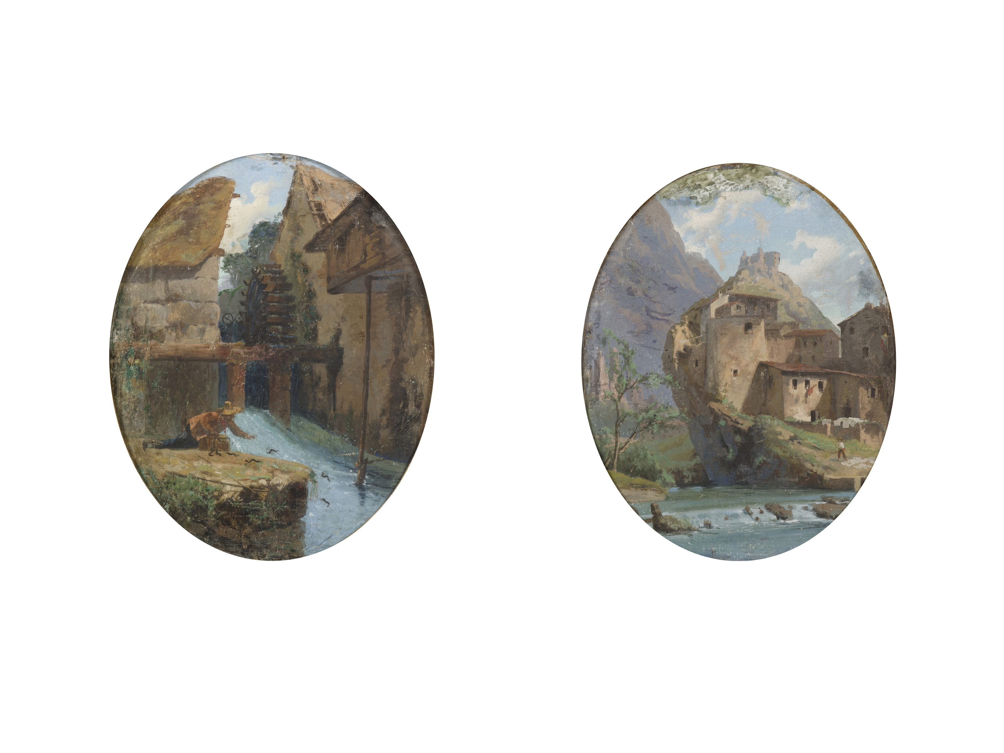 Scuola italiana (fine XIX secolo) Coppia di paesaggi con figure Tempera su...